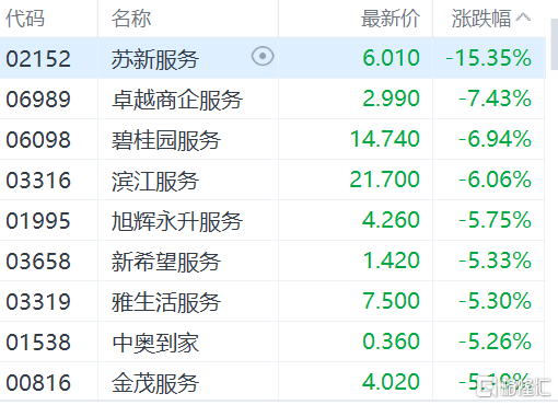 物业管理板块跟随走弱。苏新服务跌逾15%,卓越商企服务跌逾7%,碧桂园服务、滨江服务跌逾6%,旭辉永升服务、新希望服务、雅生活服务、中奥到家、金茂服务跌逾5%。