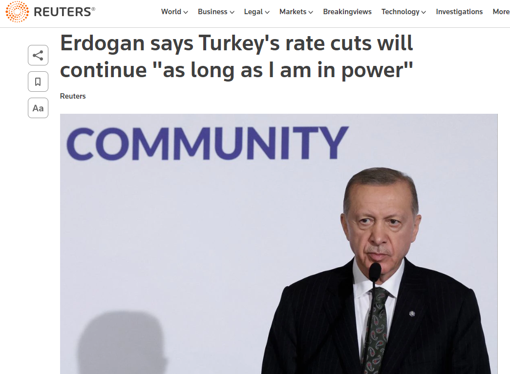 埃尔多安强调降息立场 路透社报道截图
